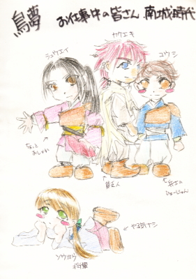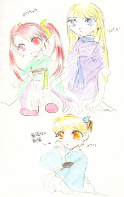 コウレツとホウスウ 第一稿 コウジャク(紅梨)第一稿 メイワ 初描き ギョウ・トウテツ 決定稿 オマケ その1 ソウヨウとそのお友だち3人組 ミニキャラ版 オマケ その2 ホウチョウ、リョウジ、メイワ ミニキャラ版